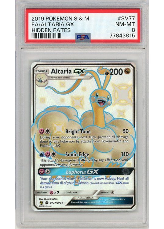 Du køber her et PSA 8 Altaria GX pokemon kort fra S&M Hidden Fates serinen.