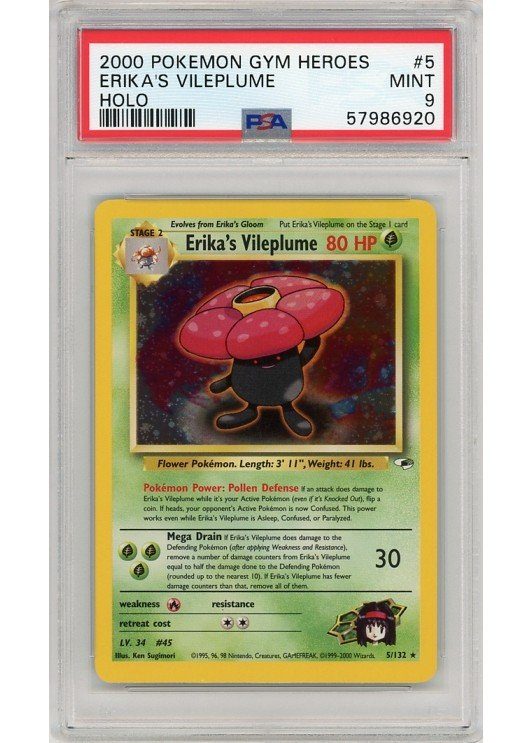 Du køber her et PSA 9 Erika’s Vileplume pokemon kort fra Gym Heroes serinen.
