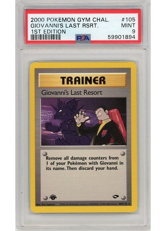 Du køber her et PSA 9 Giovanni’s Last Resort 1st Edition pokemon kort fra Gym Challenge serinen.