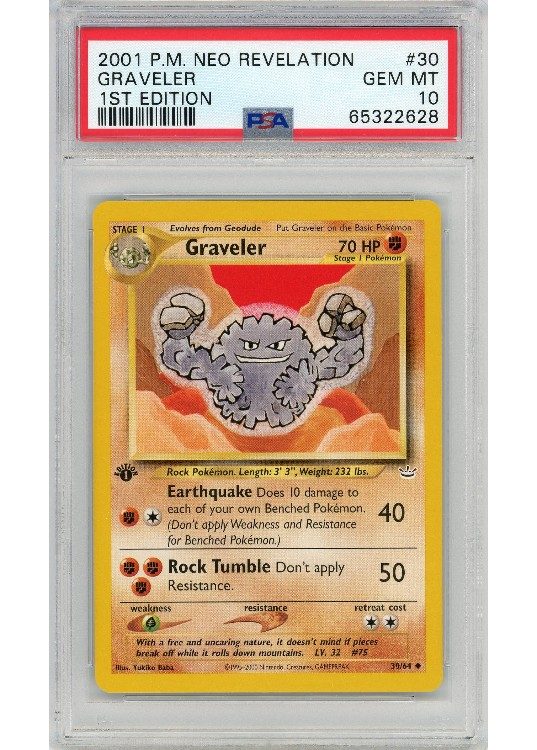 Du køber her et PSA 10 Graveler 1st Edition pokemon kort fra Neo Revelation serinen.