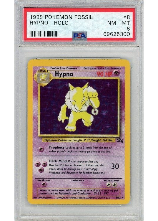 Du køber her et PSA 8 Hypno pokemon kort fra Fossil serinen.