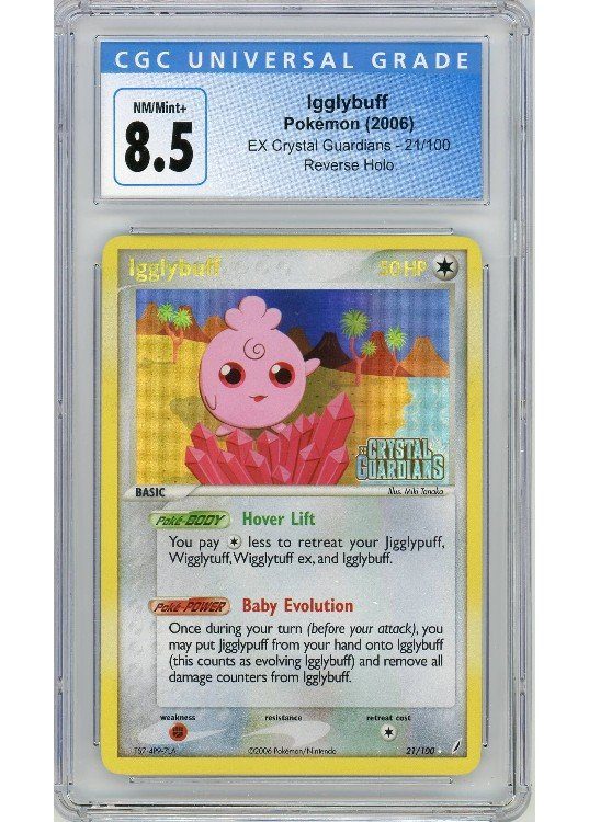 Du køber her et CGC 8.5 Igglybuff Reverse Foil pokemon kort fra EX Crystal Guardians serinen.