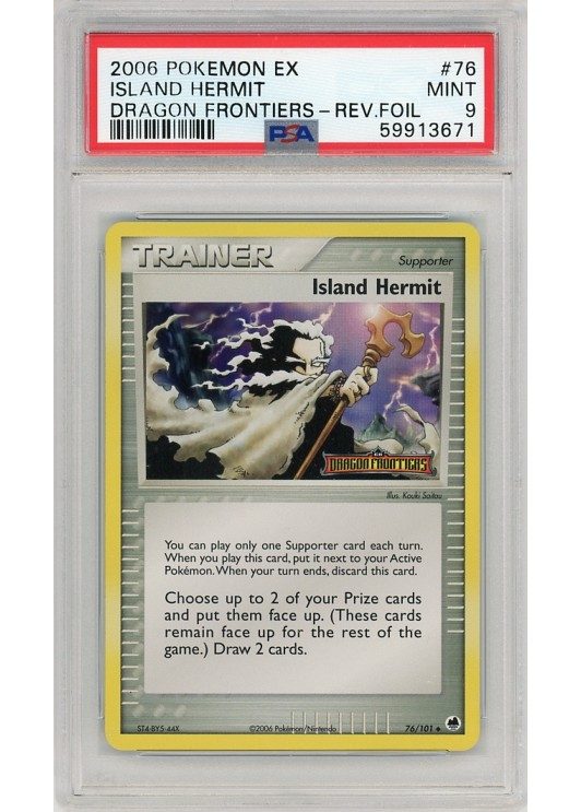 Du køber her et PSA 9 Island Hermit Reverse Foil pokemon kort fra EX Dragon Frontiers serinen.