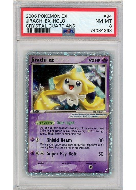 Du køber her et PSA 8 Jirachi ex pokemon kort fra EX Crystal Guardians serinen.