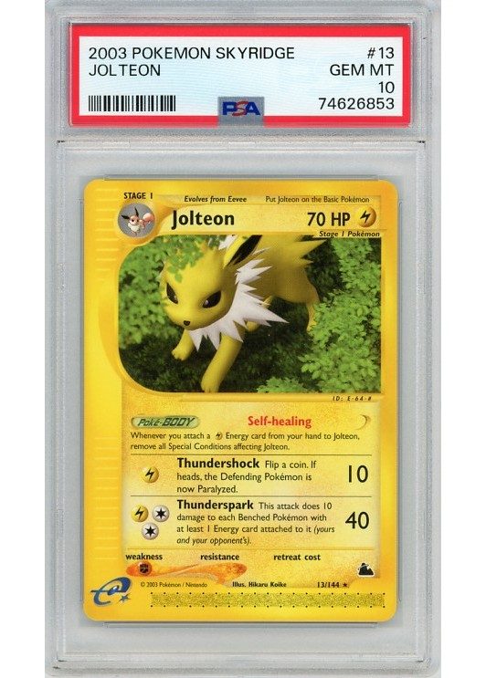 Du køber her et PSA 10 Jolteon pokemon kort fra Skyridge serinen.