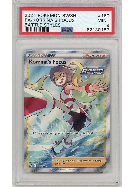 Du køber her et PSA 9 Korrina’s Focus pokemon kort fra SWSH Battle Styles serinen.