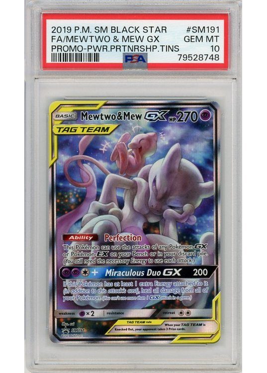 Du køber her et PSA 10 Mewtwo & Mew GX pokemon kort fra SM Black Star Promo serinen.