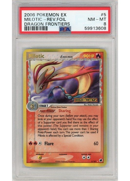Du køber her et PSA 8 Milotic δ Reverse Foil pokemon kort fra EX Dragon Frontiers serinen.