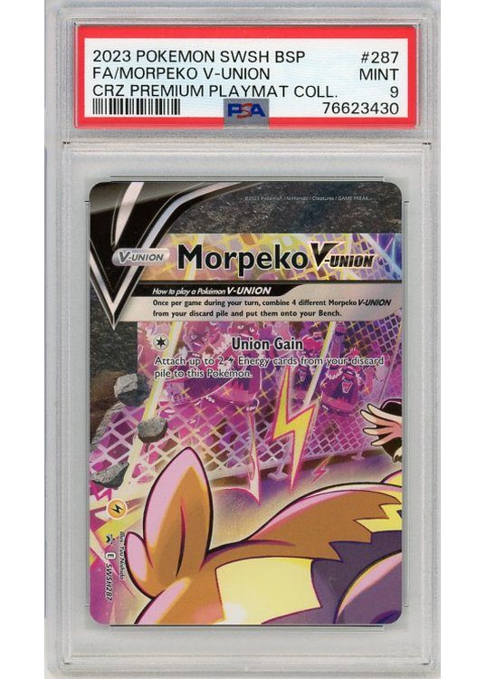 Du køber her et PSA 9 Morpeko V-Union pokemon kort fra SWSH Black Star Promo serinen.