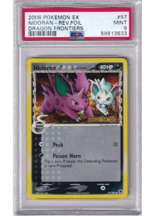 Du køber her et PSA 9 Nidoran ♂ δ Reverse Foil pokemon kort fra EX Dragon Frontiers serinen.