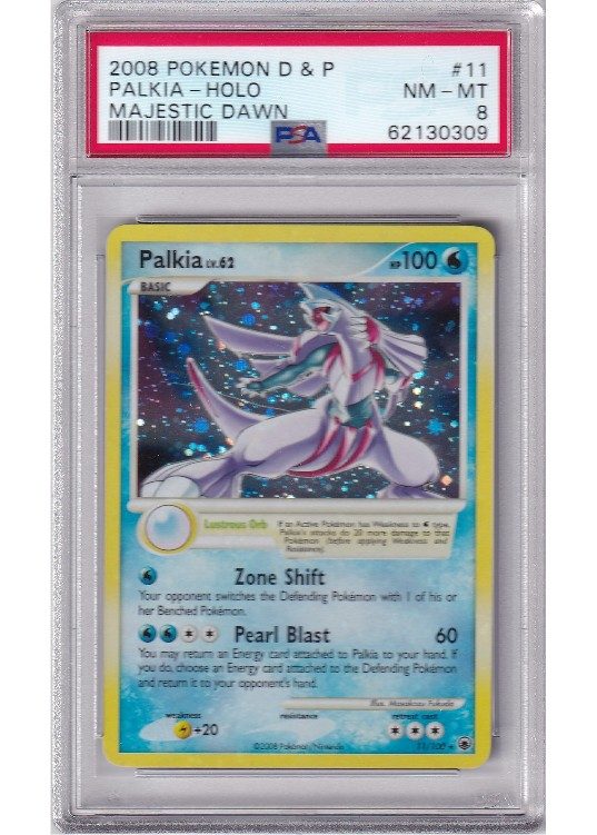 Du køber her et PSA 8 Palkia pokemon kort fra D&P Majestic Dawn serinen.