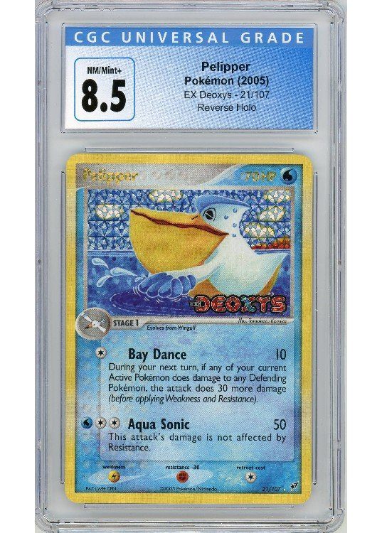 Du køber her et CGC 8.5 Pelipper Reverse Foil pokemon kort fra EX Deoxys serinen.