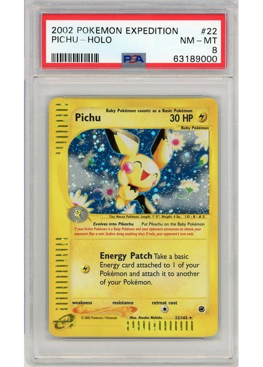 Du køber her et PSA 8 Pichu pokemon kort fra Expedition serinen.