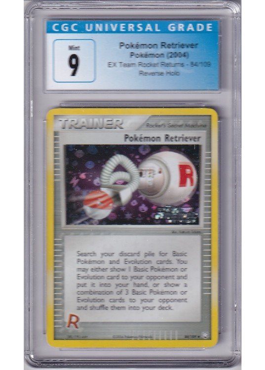 Du køber her et CGC 9 Pokémon Retriever Reverse Foil pokemon kort fra EX Team Rocket Returns serinen.