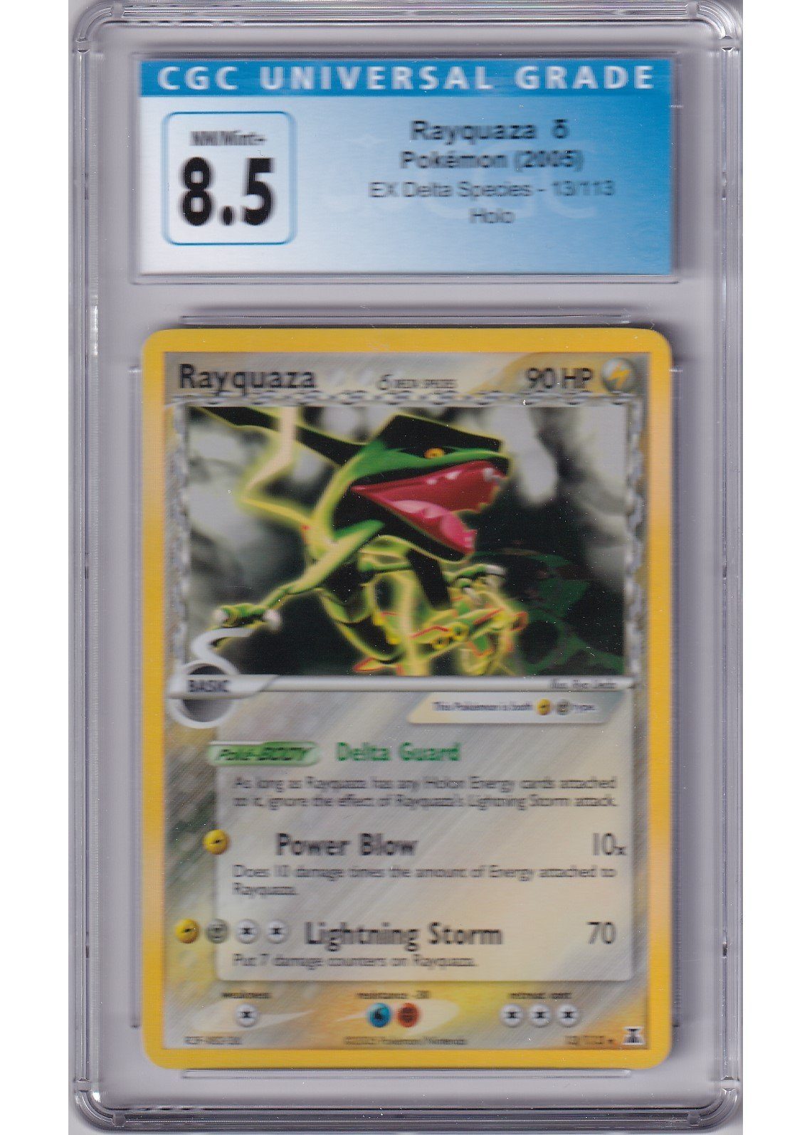 Du køber her et CGC 8.5 Rayquaza δ pokemon kort fra EX Delta Species serinen.