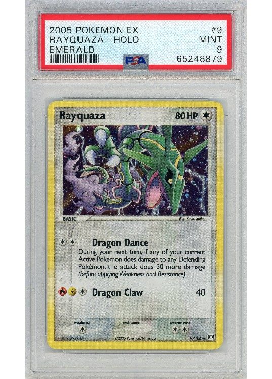 Du køber her et PSA 9 Rayquaza pokemon kort fra EX Emerald serinen.