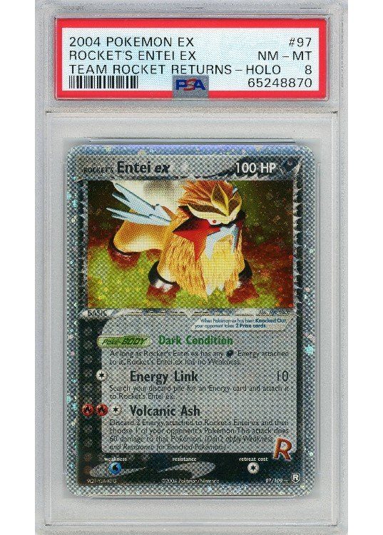 Du køber her et PSA 8 Rocket’s Entei ex pokemon kort fra EX Team Rocket Returns serinen.