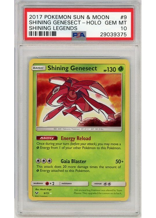 Du køber her et PSA 10 Shining Genesect pokemon kort fra S&M Shining Legends serinen.