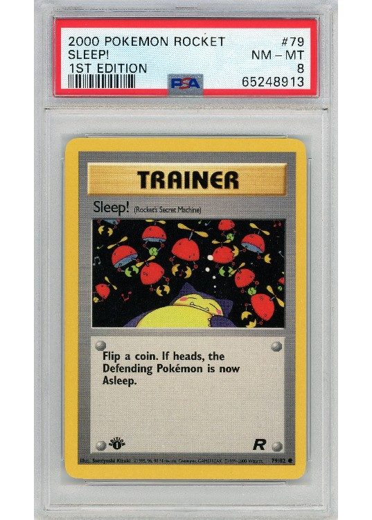 Du køber her et PSA 8 Sleep! 1st Edition pokemon kort fra Team Rocket serinen.