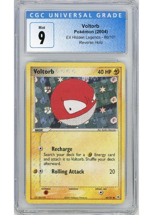Du køber her et CGC 9 Voltorb Reverse Foil pokemon kort fra EX Hidden Legends serinen.